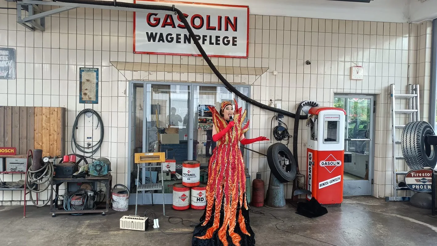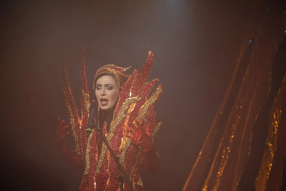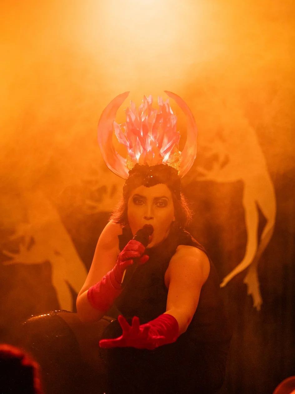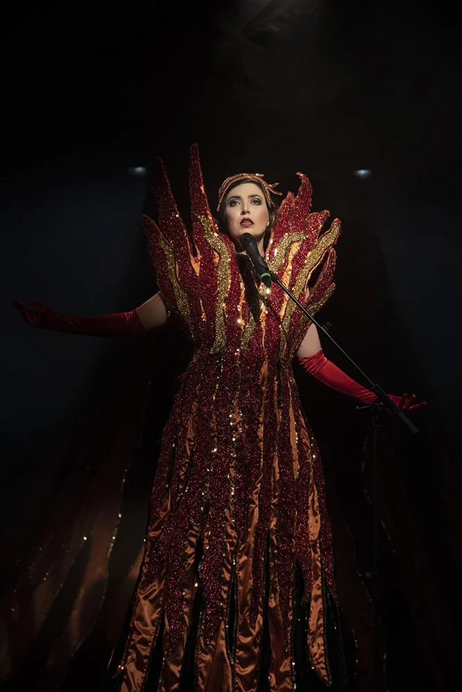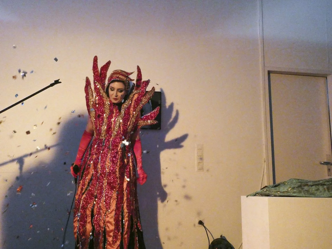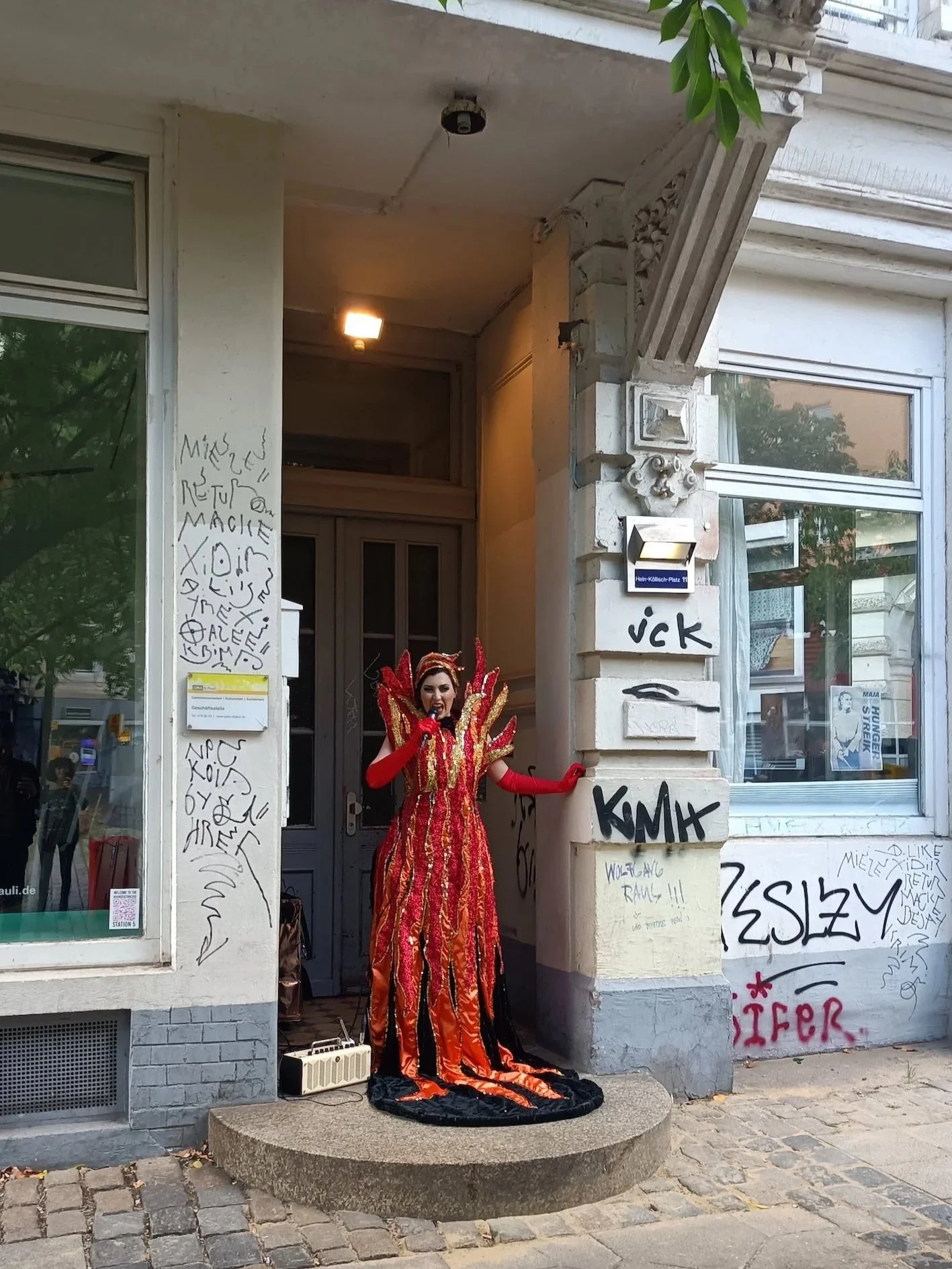 With the solo performance "ERUPTIVA EXTRAVAGANZA - A Volcanic Disruption", the performance artist Nolundi Tschudi impersonates the volcano as a drag-persona of the catastrophic. She dances on the edge of the abyss – dissecting the seductive power and bizarre poetry of the moment when everything threatens to vanish in destruction. In her lava glowing illuminations a neo-surrealistic scenario emerges, that dares to tread the fine line between vaudevillian lightness and performative, brute immediacy – unleashing an ectasy that underlies the Zeitgeist of the 1920s and today.